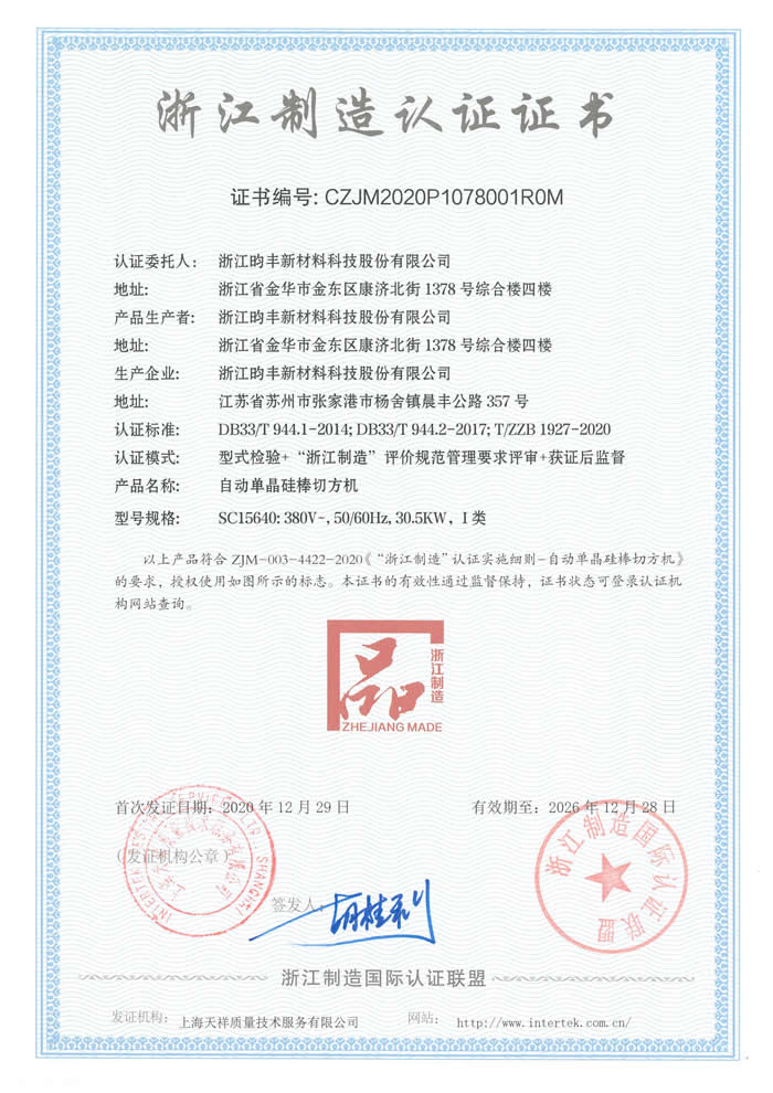 2020年12月底,昀丰科技SC系列自动单晶硅棒切方机已顺利通过“浙江制造”认证,并获得《浙江制造认证证书》,成为国内光伏装备制造行业内优先通过“浙江制造”认证的企业。